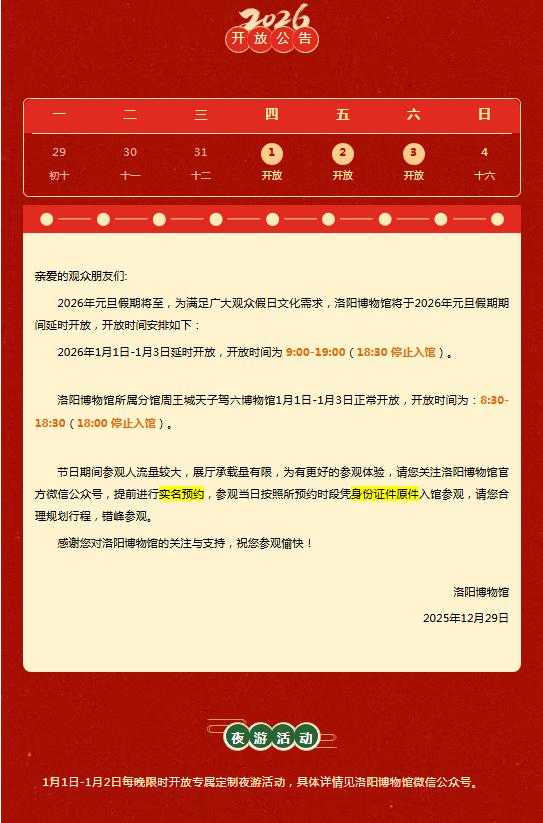 12月29日,记者从洛阳博物馆获悉,为满足广大观众假日文化需求,该馆及所属周王城天子驾六博物馆将在2026年元旦假期推出开放时间调整举措,其中主馆延时开放,分馆正常开放股票配资公司开户网站,同时提醒观众提前预约、错峰参观。